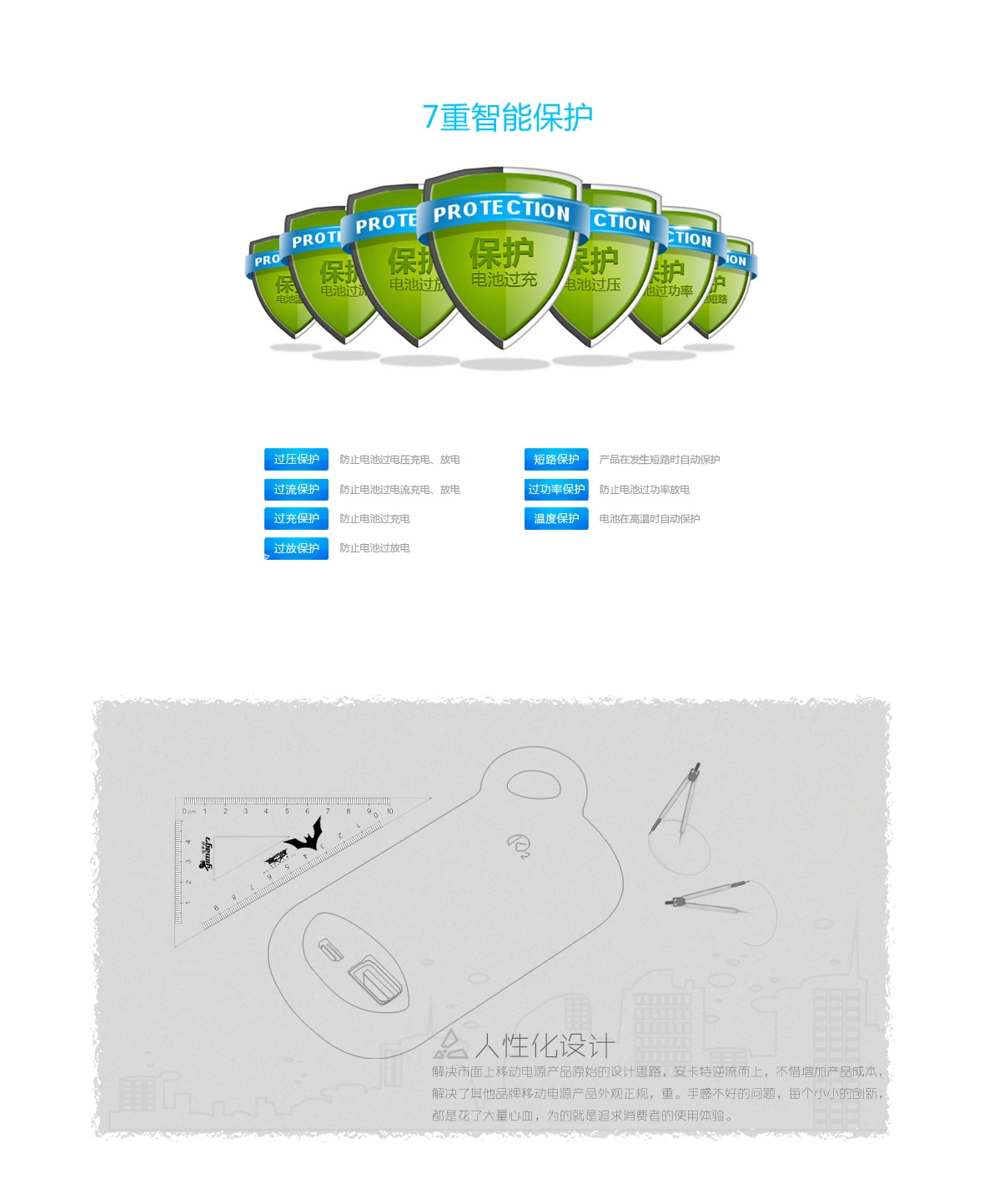 安全功能:智能CPU芯片控制,防止过充,过放,过流,短路,过温,智能极性反向保护。